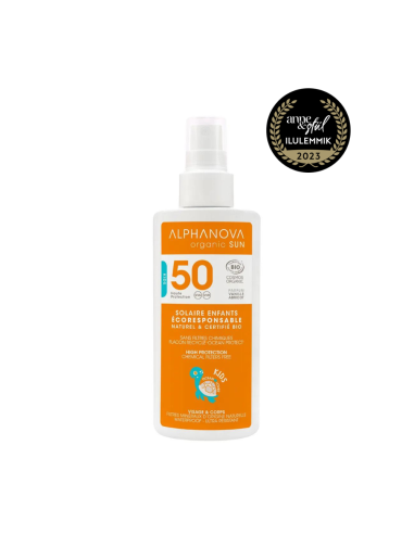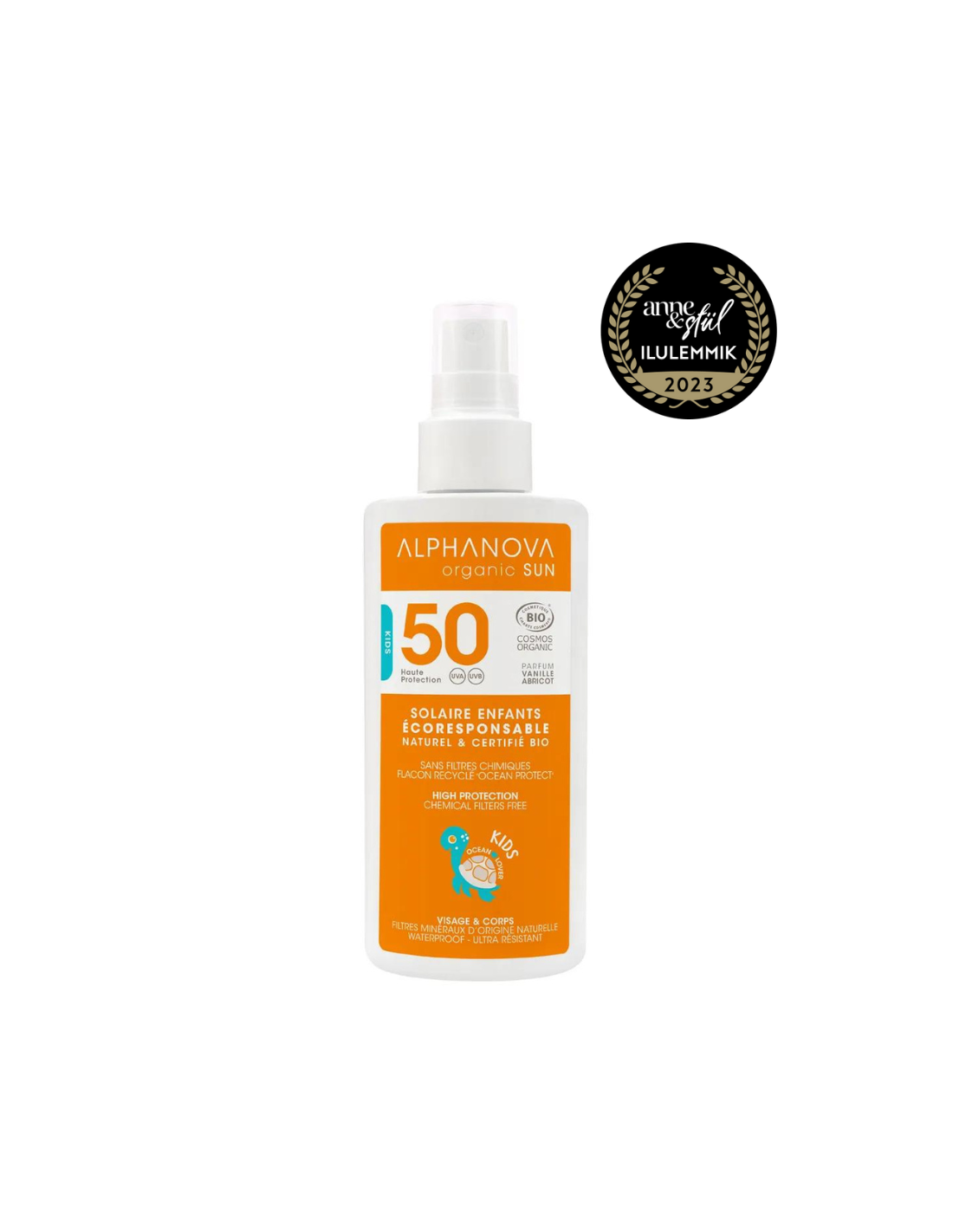 Alphanova Sun - Orgaaniline vanilje-aprikoosi lõhnaga väga veekindel mineraalne päikesekreem sprei lastele SPF50, 125ml