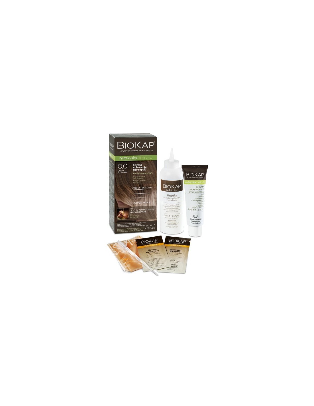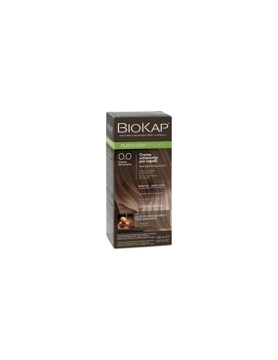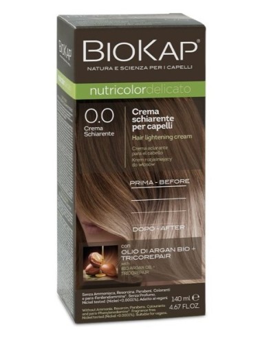 Biokap® Nutricolor 0.00 on delikaatne helendav kreem argaaniõliga ja taime-ekstraktidega. Helendab juukseid 2 tooni võrra. Sobib salkude tegemiseks. Tumeblondid juuksed teeb heleblondiks, kastani heledaks kastaniks. Punased- ettevaatust- võib muutuda oranzikaks ! Tume kastan ja must- ei soovitata värvimiseks. Muudab juuksed siidiseks ja kergesti kammitavaks.