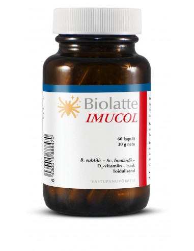 Biolatte Imucol kapslid on spetsiaalselt loodud immuunsüsteemi ja seedetrakti mikrofloora tugevdamiseks. Toidulisand ühendab Saccharomyces boulardii probiootilise pärmi, Bacillus subtilise, D3-vitamiini, tsingi ja maapirni kiudained – kõik koosmõjus toetavad keha loomulikku kaitsevõimet. Bacillus subtilis aitab aktiveerida antikehasid tootvaid rakke ja võidelda patogeenidega, samas kui S. boulardii toetab limaskestade terviklikkust ja tasakaalustab mikrobioomi. D3-vitamiin ja tsink aitavad kaasa immuunsüsteemi normaalsele toimimisele. Maapirni kiudained toetavad heade bakterite kasvu. Sobib kasutamiseks aastaringselt ja on vaba kaseiinist, laktoosist, gluteenist ning tavalisest pärmist. Toode sobib ka veganitele ning rasedatele ja lastele.
