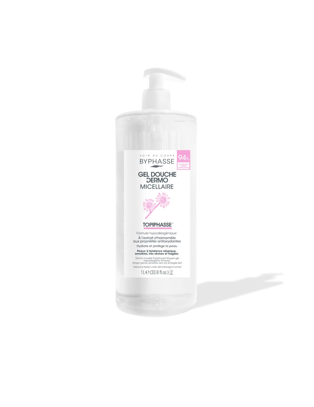 Byphasse – Dermo mitsellaarne dušigeel "TOPIPHASSE" väga kuivale nahale, 1L on õrn, seebivaba ja pH-neutraalne pesuvahend, mis on loodud spetsiaalselt väga kuiva, tundliku ja atoopilise naha igapäevaseks hoolduseks. Selle mitsellaarne koostis puhastab naha õrnalt, eemaldades mustuse ja saasteosakesed ilma naha kaitsebarjääri kahjustamata.