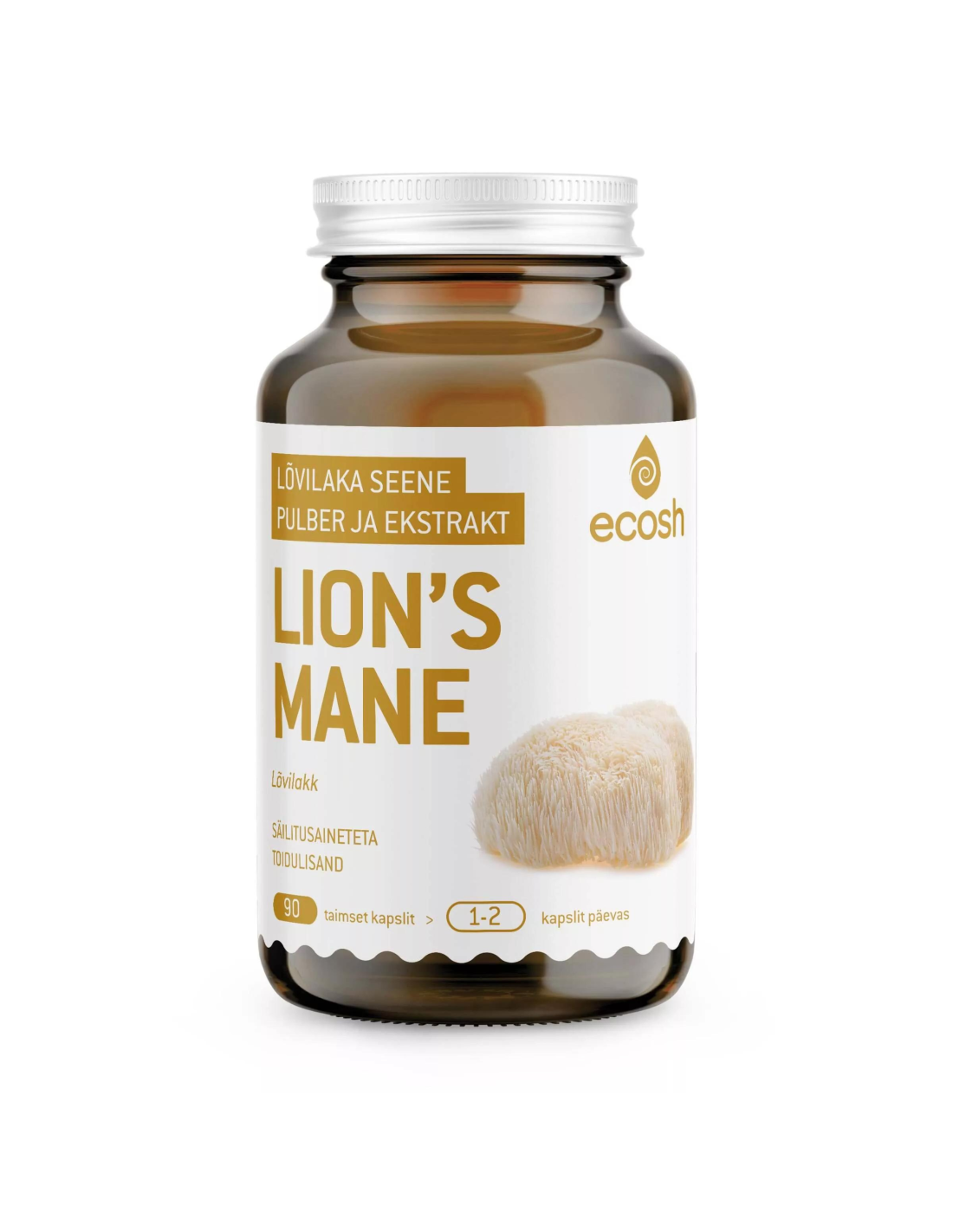 KOOSTISOSAD: Lõvilakk-korallnarmiku (Hericium erinaceus) seene maapealse osa ehk viljakeha pulber, Lõvilakk-korallnarmiku (Hericium erinaceus) seene maapealse osa ehk viljakeha ekstrakt 10:1 (sisaldab 30% polüsahhariide), glaseeraine: pullulaan (taimne kapsel).