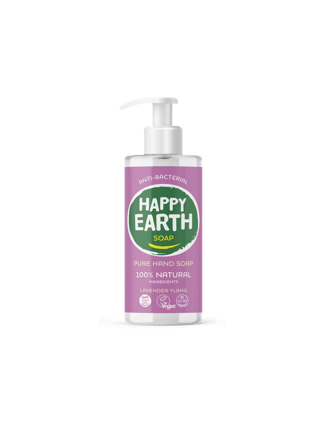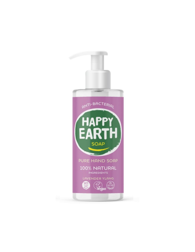 Hõrgutava lavendli-ylangi lõhnaga käteseep on antibakteriaalne, biolagunev ning sellel on taimne koostis koos botaaniliste ekstraktide ja eeterlike õlidega. Happy Earth Hand Soap on 100% looduslik, 100% efektiivne ja sisaldab 0% kemikaale.