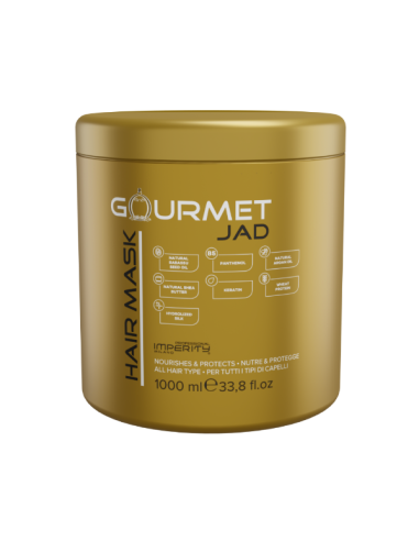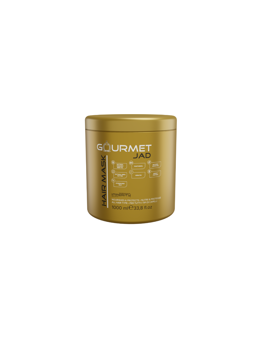 Imperity Professional Gourmet Jad juuksemask (1000 ml) on luksuslik hooldustoode, mis on loodud kuivade, kahjustatud ja elujõuetute juuste taastamiseks ja niisutamiseks. Mask on rikastatud argaaniaõli, keratiini, sheavõi ja siidiproteiinidega, mis sügavniisutavad juukseid, parandavad nende struktuuri ja taastavad loomuliku elastsuse.