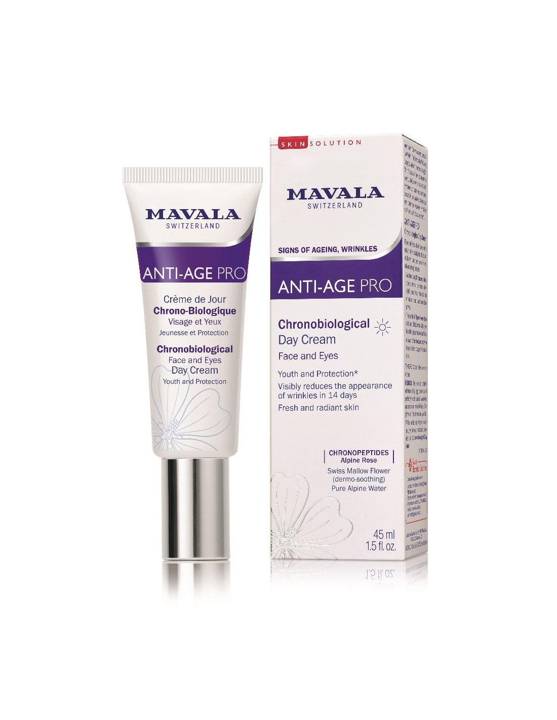 Mavala Anti-Age PRO Chronobiological Day Cream on noorendav päevakreem, mis on loodud töötama kooskõlas naha loomuliku ööpäevase rütmiga. Nahk kaitseb end peamiselt päeval ja uuendab end öösel – kuid unepuudus, stress, saaste, suitsetamine ja UV-kiirgus võivad seda rütmi häirida. Kui päeva jooksul langeb naha niiskustase ja kaitsevõime, võib jume tunduda tuhmim ning peened jooned ja kortsukesed tulla rohkem esile. Kreem aitab hoida naha päeva jooksul niisutatuna, pehmena ja mugavana, et nahk näiks ühtlasem ja värskem.