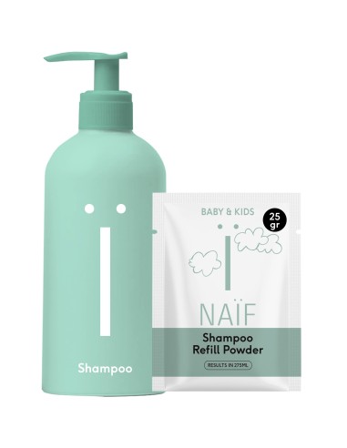 Naïf šampoon on spetsiaalselt loodud laste juustele ja peanahale. Puhastab õrnalt laste peanahka ja juukseid. Sobib kõikidele juuksetüüpidele. Täitepulbri kasutamine aitab vähendada plastikulu ning säästa umbes 64% CO2 aastas. 1 pakend = 275ml pesugeeli.