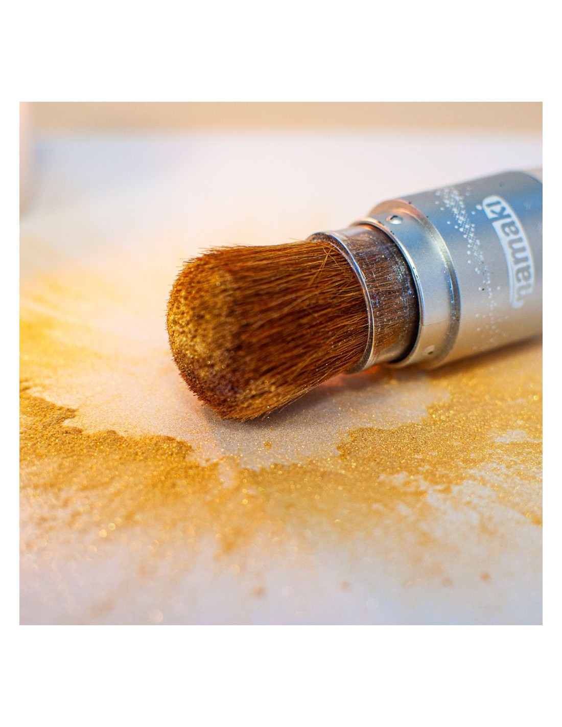Keera pintsli alumine kruvi lahti, ava kaas ja kalla kuldne särapuuder pintslisse. Sule tihedalt ja raputa kergelt, kuni särapuuder liigub harjaste tippu. Kanna sädelus nahale, juustele või kehale, et luua maagiline ja pidulik tulemus.