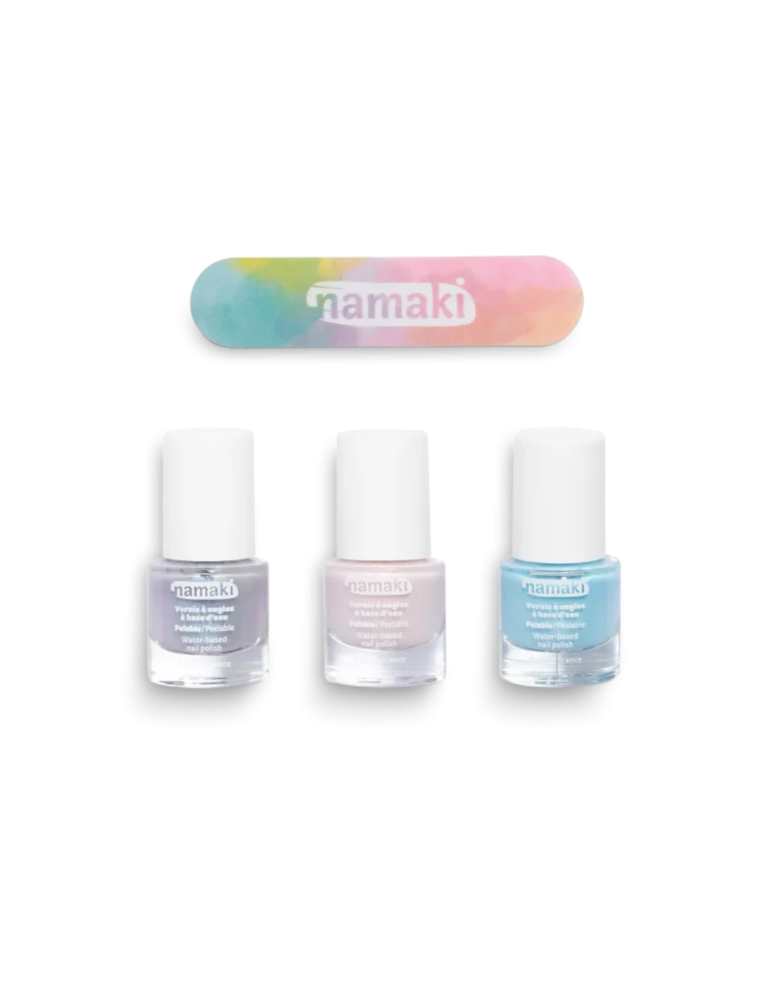 Namaki “Frozen Sweets” on kolmest veepõhisest, mahakooritavast küünelakist ja viilist koosnev komplekt, mis pakub lastele lõbusat ja ohutut viisi oma küüsi kaunistada. Komplekti kuuluvad toonid Frosty Blue, Pale Pink ja Silver Blue – kõik kergesti eemaldatavad nagu kleepekad!