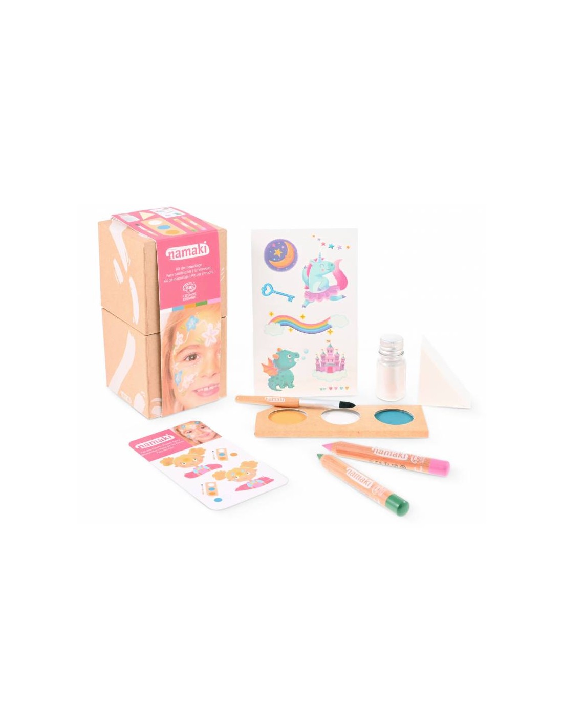 Namaki “Magical World” kinkekomplekt on tõeline unistuste komplekt väikestele kunstnikele, kes armastavad värve, sära ja fantaasiat. See 100% looduslik ja COSMOS Organic sertifikaadiga laste näomaalingukomplekt on loodud selleks, et pakkuda ohutut ja loovat mänguelamust ilma nahka ärritamata. Kõik tooted on nahasõbralikud, pestavad ning valmistatud mahepõllumajandusest pärit koostisosadest.