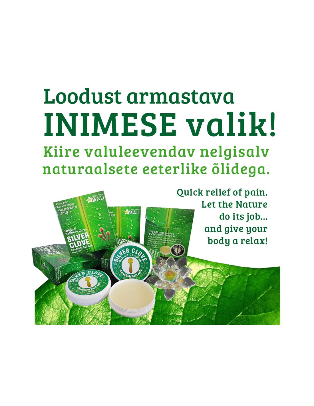 Valuleevendav nelgisalv, mida tuntakse ka kui Silver Clove salvi, on tõhus vahend erinevate valude leevendamiseks. See palsam on eriti efektiivne peavalu, kange kaela ja õla, samuti lihas- ja liigesvalude (sealhulgas reumaatiliste ja spordivigastustest tulenevate) korral. Lisaks sellele pakub see abi ka nohu, köha ja putukahammustuste sügeluse vastu.