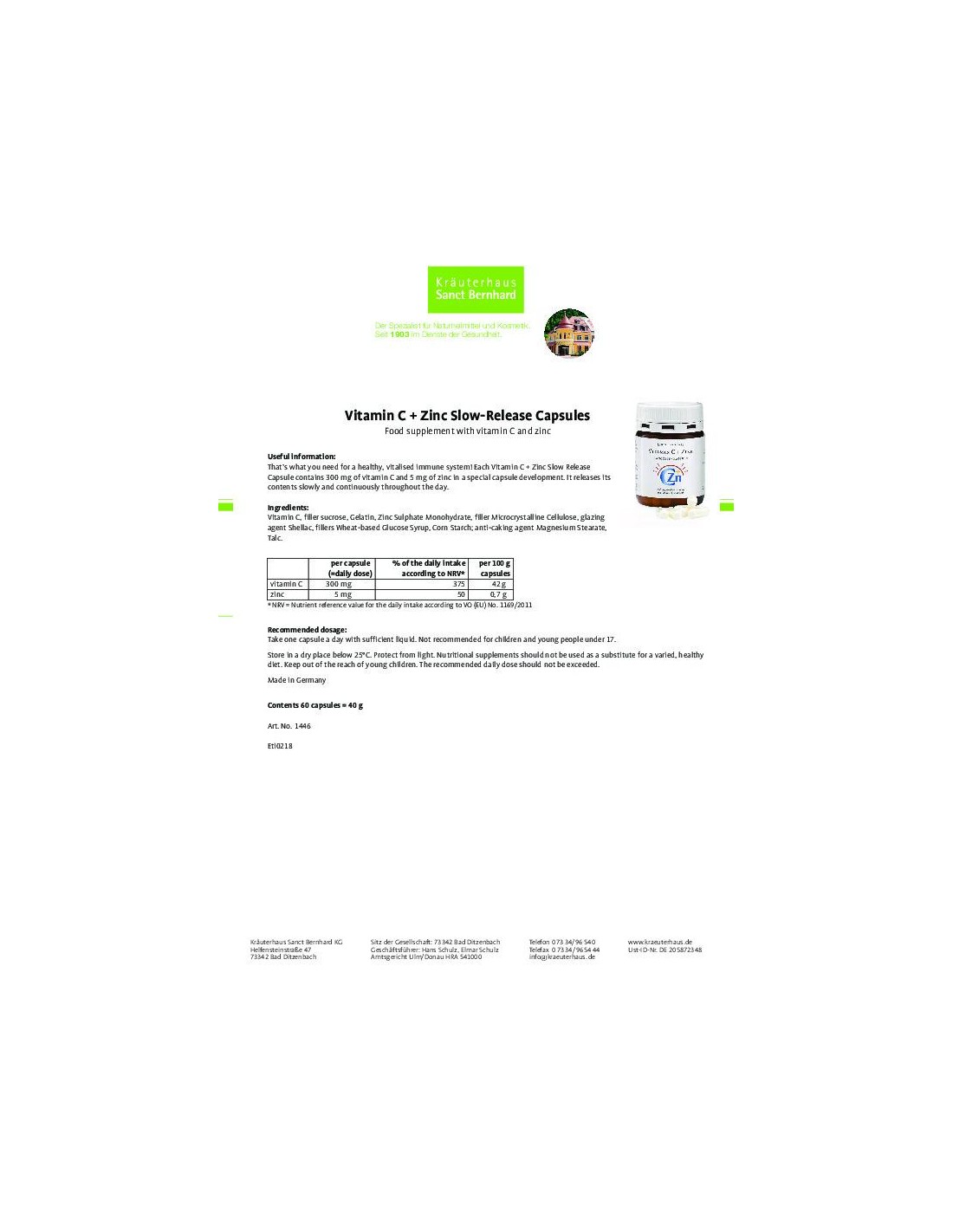 C-vitamiin ja tsink toetavad immuunsüsteemi. Iga kapsel sisaldab 300mg C-vitamiini ja 5mg tsinki. Aeglase toimega C-vitamiin, mis tagab selle, et keha saab vitamiini järk-järgult kogu päeva jooksul. 60 kapslist piisab kaheks kuuks.