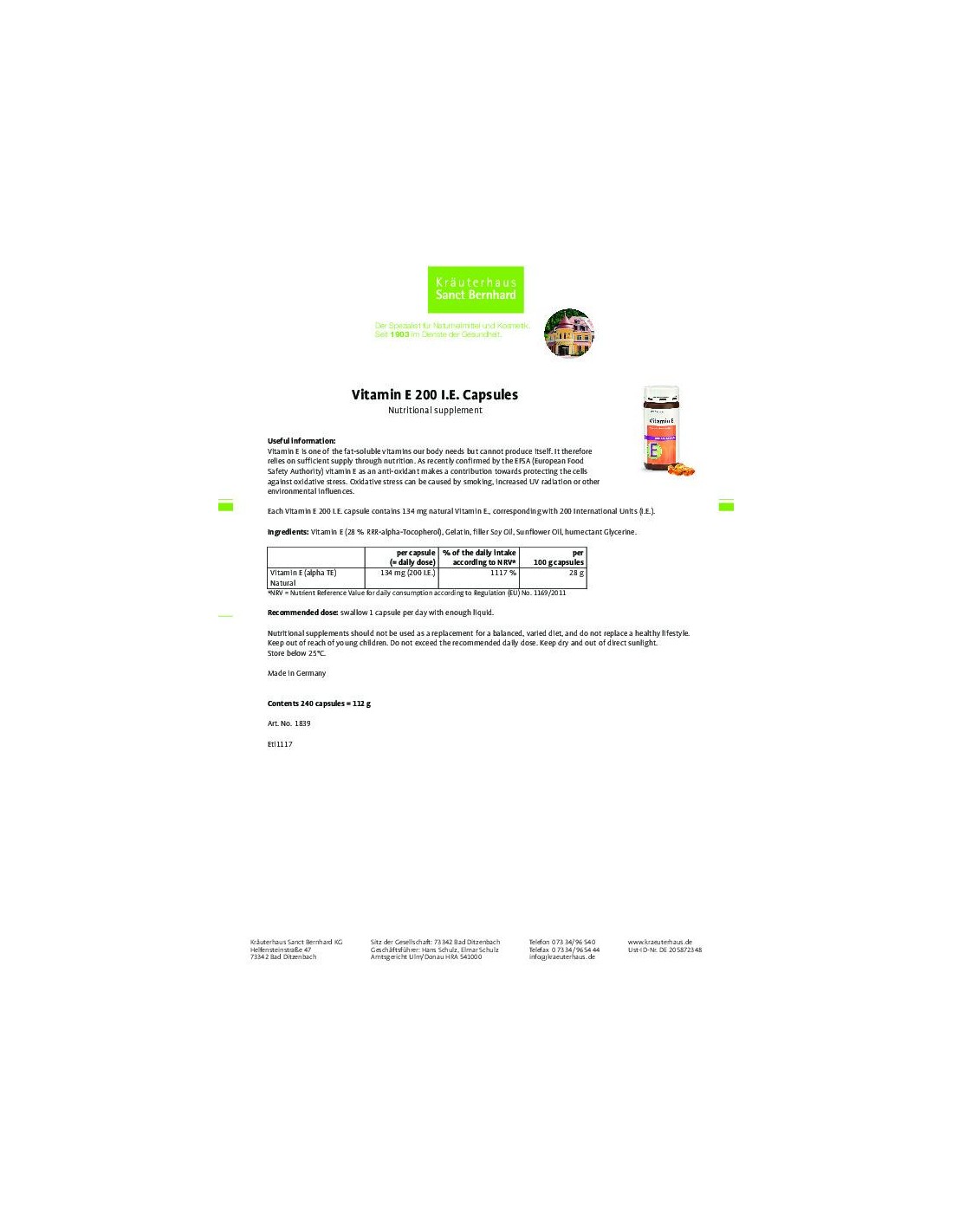 Koostisosad: E-vitamiin (28% RRR-alfa-tokoferool), želatiin, sojaõli, päevalilleõli, glütseriin. 1 kapsel sisaldab 134mg (200 I.E.) E-vitamiini.Sanct Bernhard - Vitamiin B12 Supra 200µg tabletid - kasutamine