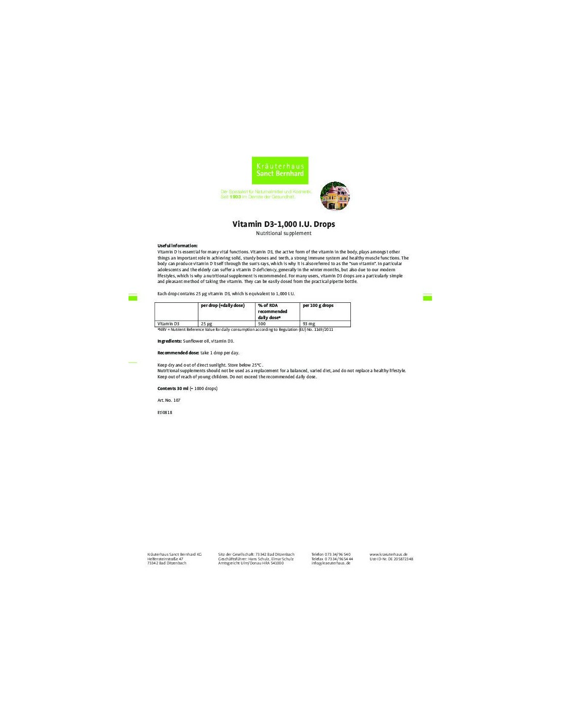 Sanct Bernhard - Vitamiin D3 (1000IU) tilgad, 30ml